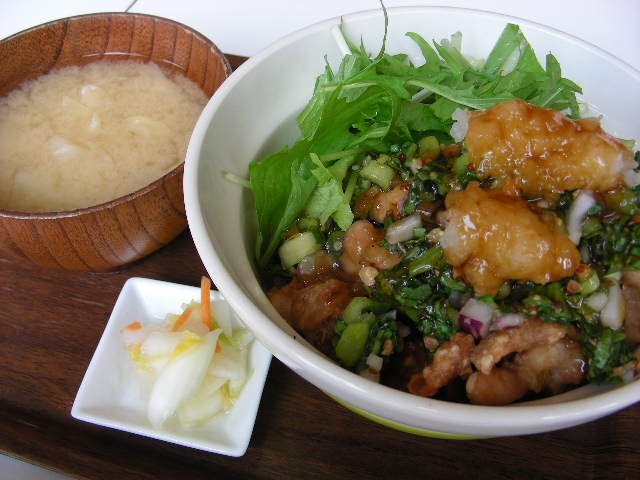 左下は jasmineさんの 和野菜まぶしの鶏唐揚げ丼 柚子風味。