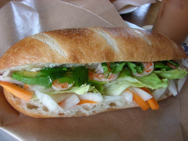 バゲットは 柔らかめのフランスパンで、 私が食べたのには エビ、アボカド、レタス、特製ベトナムなます、パクチーなどが挟まれていたよ。 メニューの説明書きによれば、ベトナムでは 庶民のファーストフードだとか