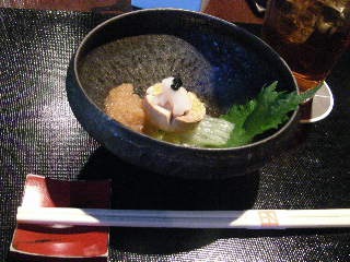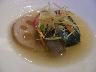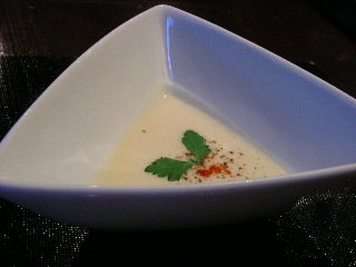左下は 酒粕と ジャガイモの ポタージュ。 超おいしかったんだけれど、ちょっとしか 入っていなかった。1.5cm位。