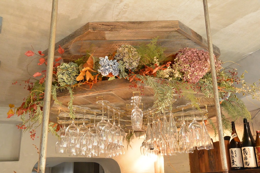 厨房の上の、グラスとドライフラワーが ぶら