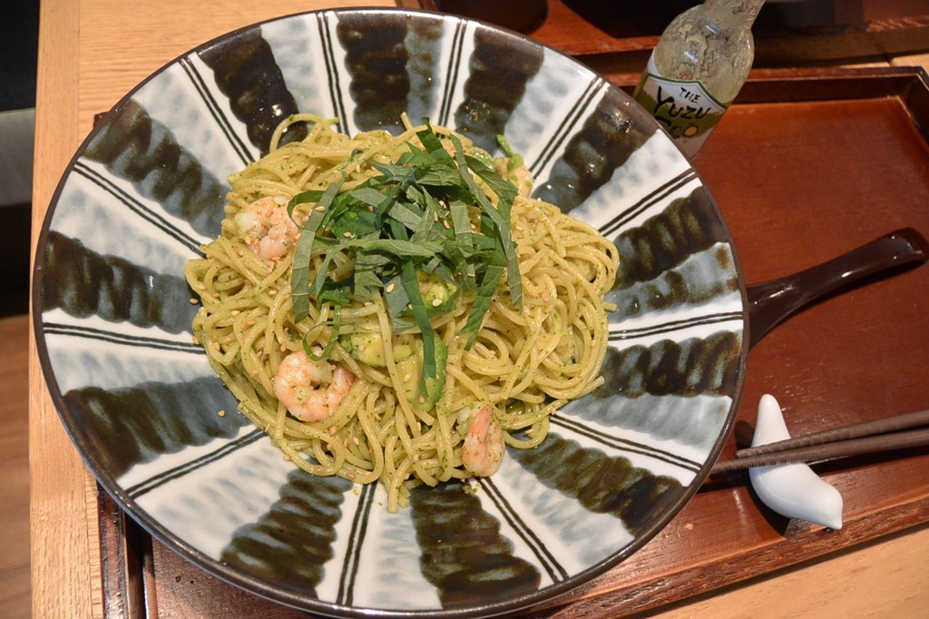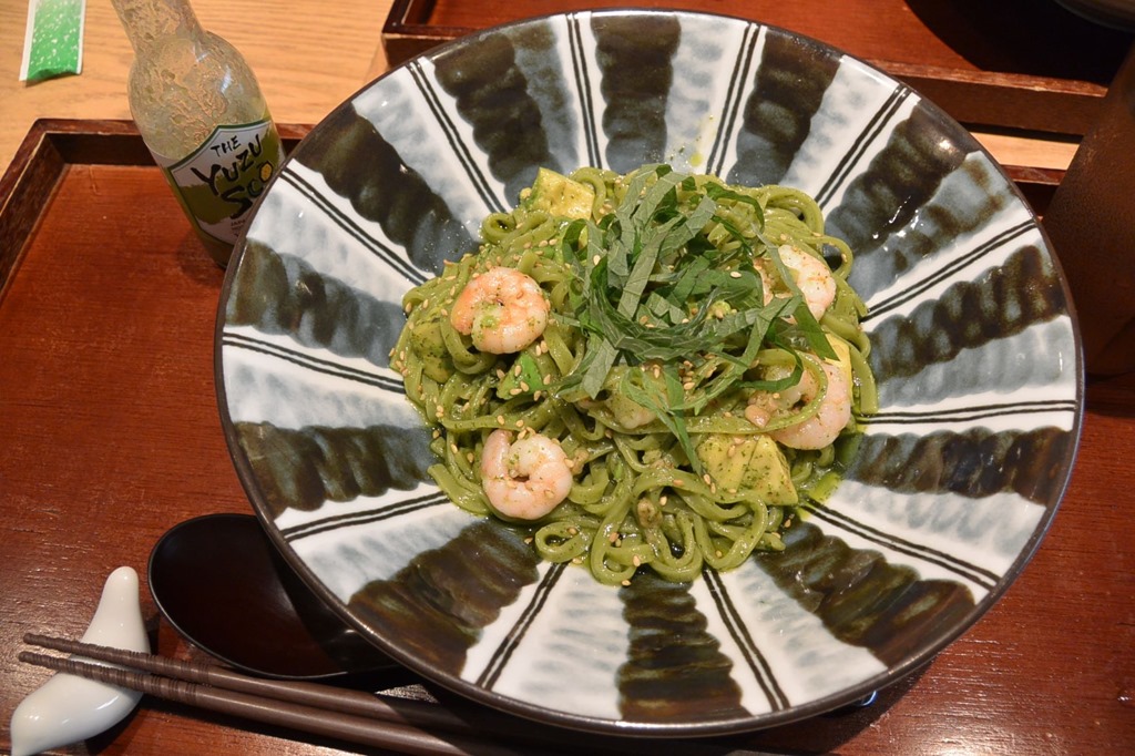 普通のスパゲティで、私は京抹茶の生パスタ。