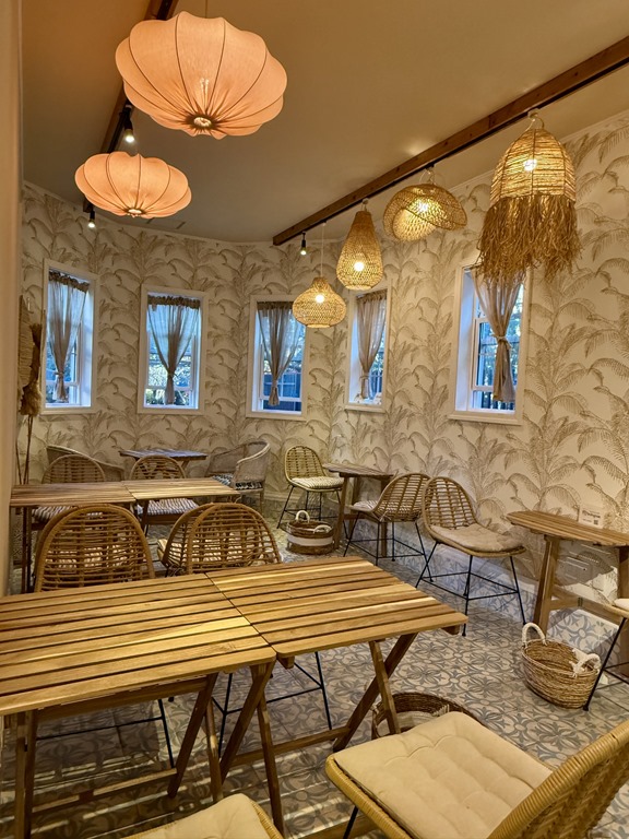 カフェスペースの テーブルが変わり、椅子は座布団が