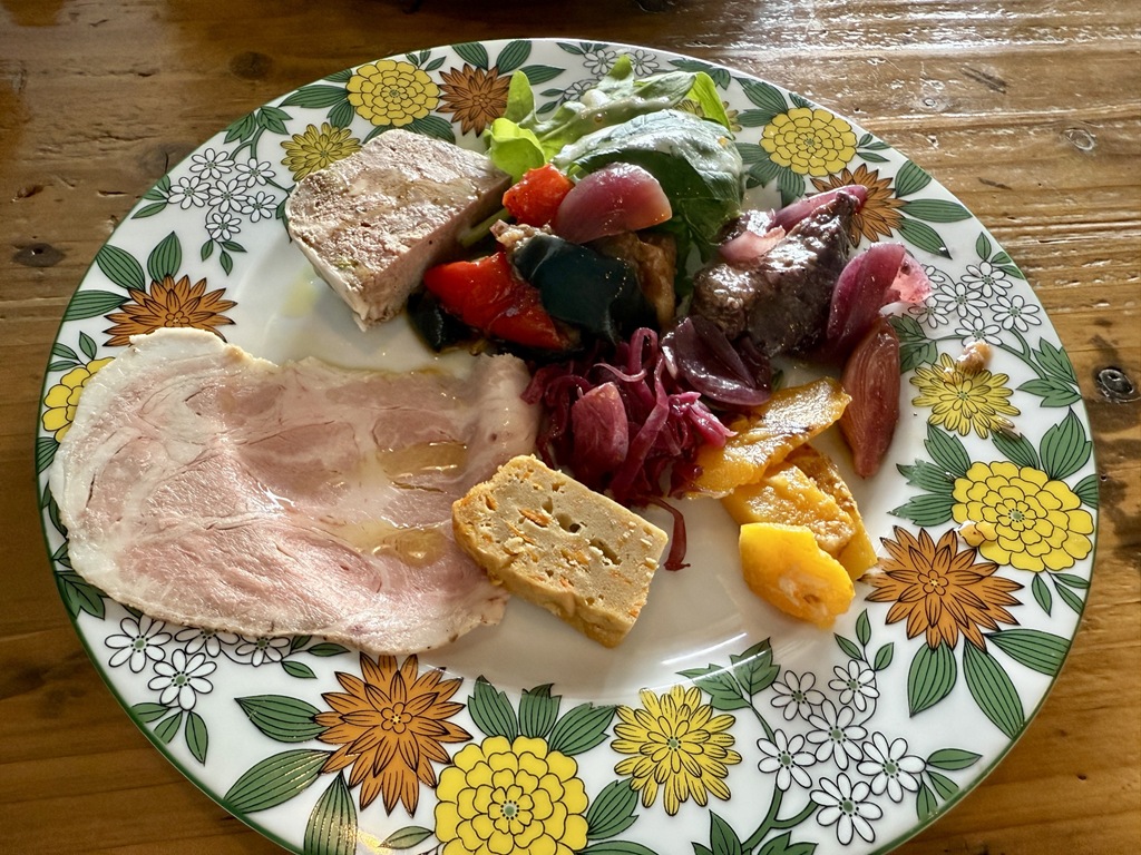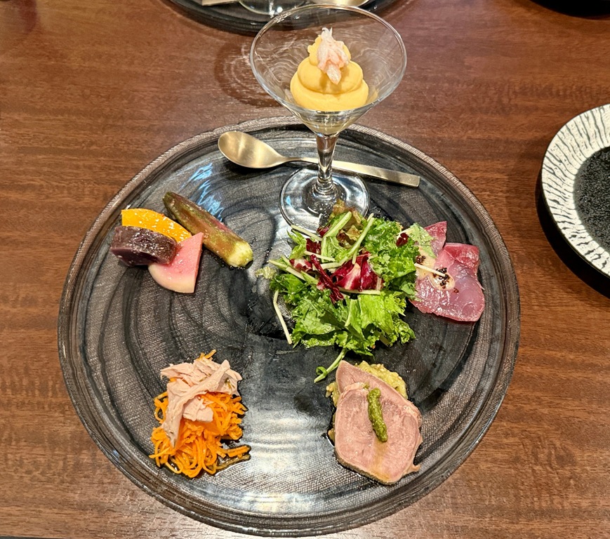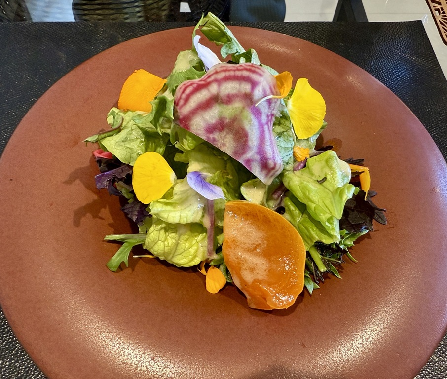 エディブルフラワーが かわいらしく、柿のピクルスが