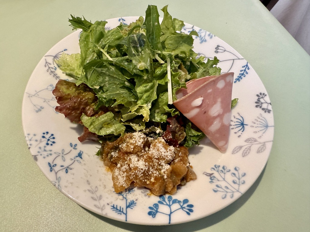 内容は、サラダ+パン+メイン+カフェ。![]()